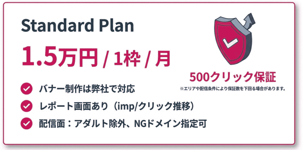 1.5万円/1枠/月(500クリック保証※)という低コストから開始可能です。