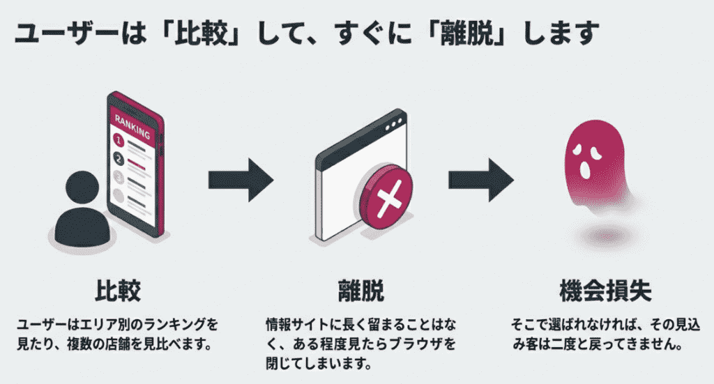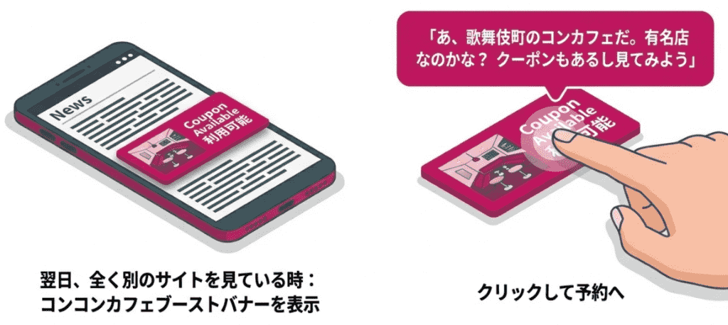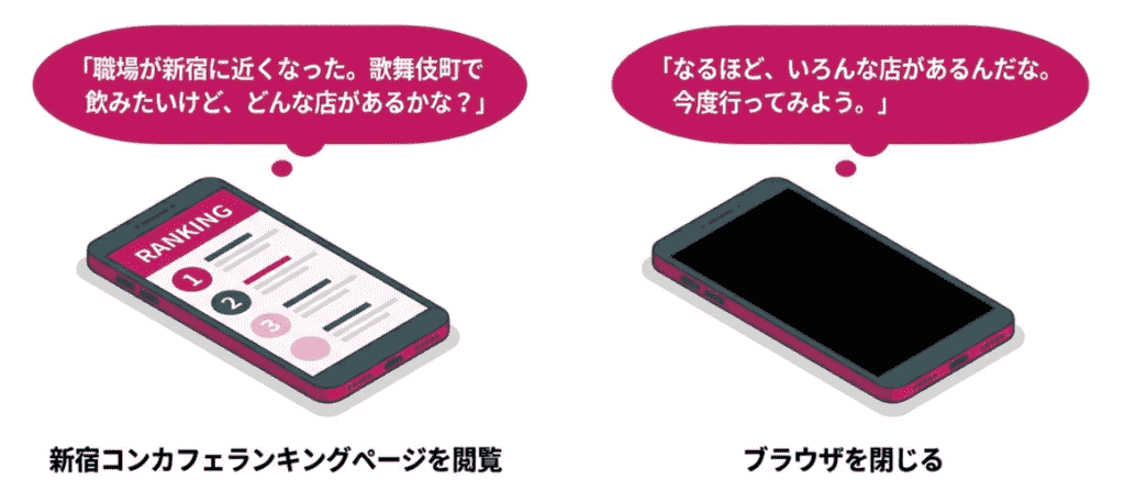コンコンカフェを訪れるユーザーは、エリア別ランキングやクーポンを探している「新規開拓層」です。しかし、多くのユーザーは気になる情報をある程度見るとすぐにサイトを離れてしまいます。この短期間の検討でリーチするのは至難の技です。