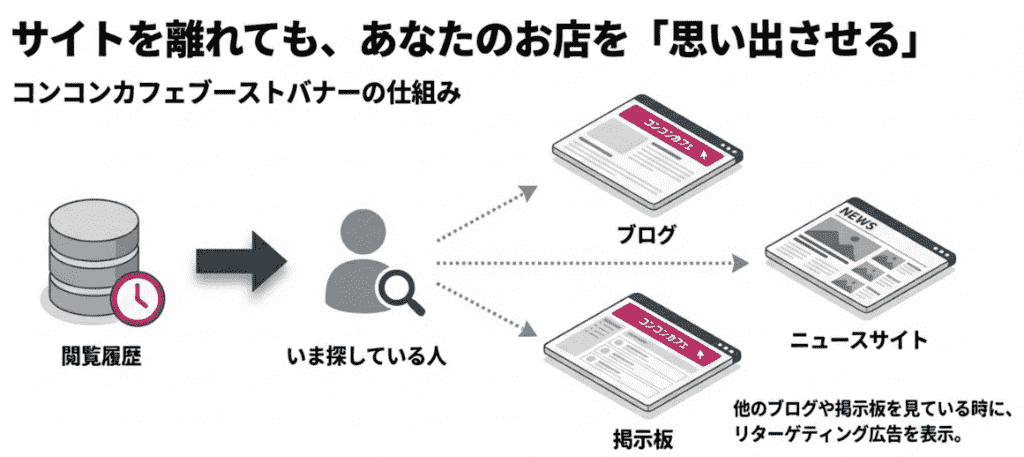 一度サイトを閲覧したユーザーを「いまコンカフェを探している人」と定義。サイトを離れた後のネットサーフィン中も、バナー広告であなたのお店を再認識させ、来店へと導きます。