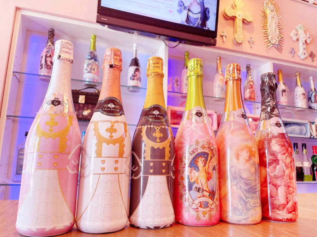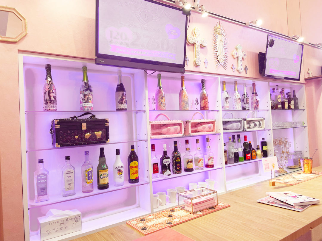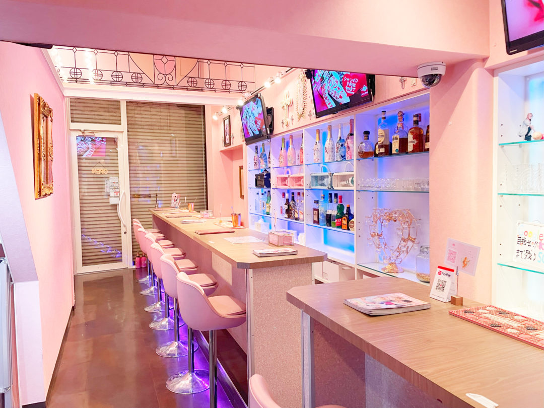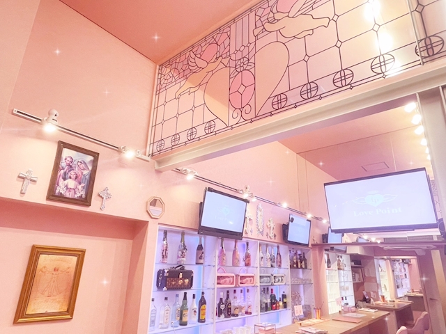 「Love Point -ラブポイント- オタロード店」は、可愛いピンクのカラーリングをベースにした空間で、1階と2階からなる店内は、お客様を魅了するキュートな装飾で満たされています。カウンターには、可愛らしいボトルが並べられており、店内全体が女の子のための特別な場所であることを強調しています。