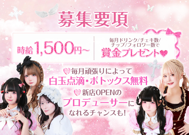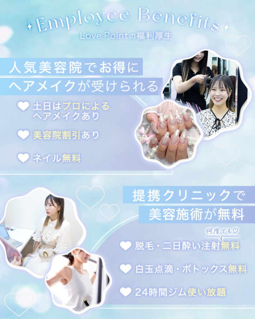 | 時給 | 体入時給1,500円~ 入店時給1,500円~ 🌹時給 1,500円~【見込み時給2700円】 +インセンティブ+週4出勤可能な方は優遇🎶 +役職手当別途支給! +毎月の頑張りによって白玉点滴・ボトックス無料 +ドリンク/チェキ/チップ/フォロワー数で賞金が発生 🌹交通費支給あり ∟1日1000円まで支給します! 🌹その他手当 ・週4日以上出勤可能な方は「特別時給サポート」あり ・副店長/店長候補は別途役職手当あり 🌹昇給あり ∟お仕事に慣れたら時給もUP! ∟がんばりに応じてバック率もUP! |