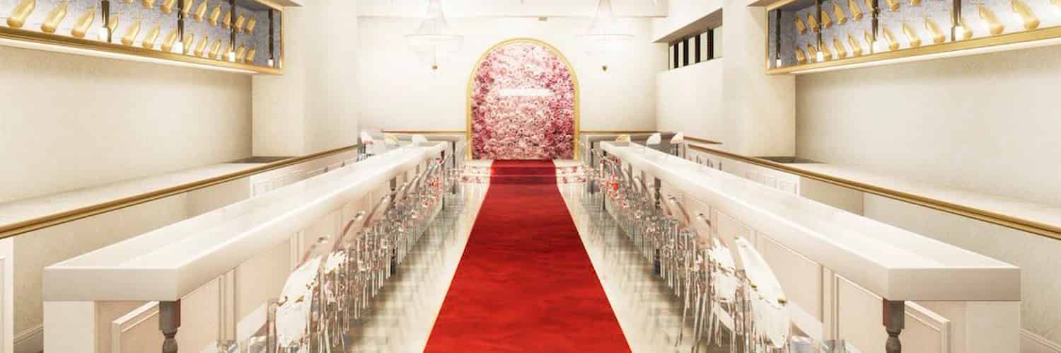 奥には赤いバラのモチーフが一面に広がる壁があり、ロマンチックで華やかな雰囲気を醸し出しています。